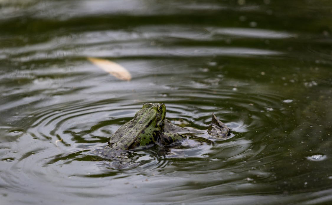 The draw here is the pond in the backyard, not a country pond for fishing but more of a water feature, the size of maybe four bathtubs. It’s just some water, but to a frog, it’s Six Flags for Amphibians.