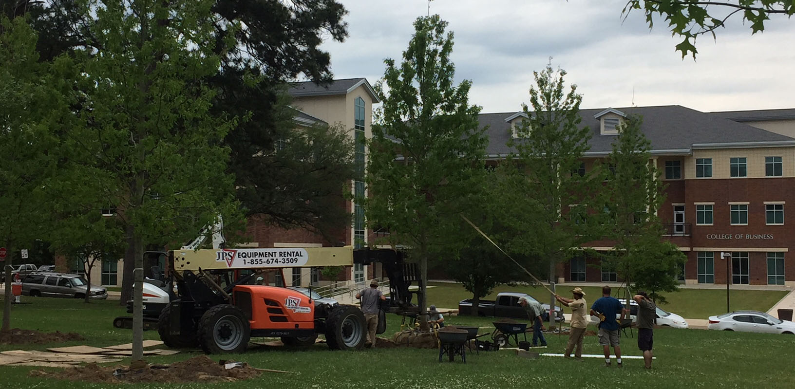 Pictured is what was happening Wednesday in Keeny Circle on campus. These studs were in the middle of planting several large Shumard Oaks. Each planting involved a fork lift, a couple of ropes, shovels and wheelbarrows, sweat, and people who could bring it.