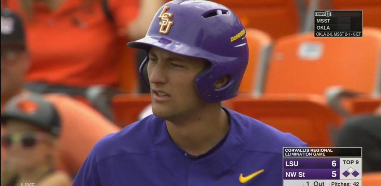 The Demons led by a run going into the bottom of the ninth, 5-4, but walked the leadoff batter — Duooh! — and LSU got an infield hit off the heel of the Northwestern pitcher and Jake Slaughter (pictured) of Choudrant got the go-ahead RBI with the infield in and LSU scored 5 in the inning and won, 9-5.