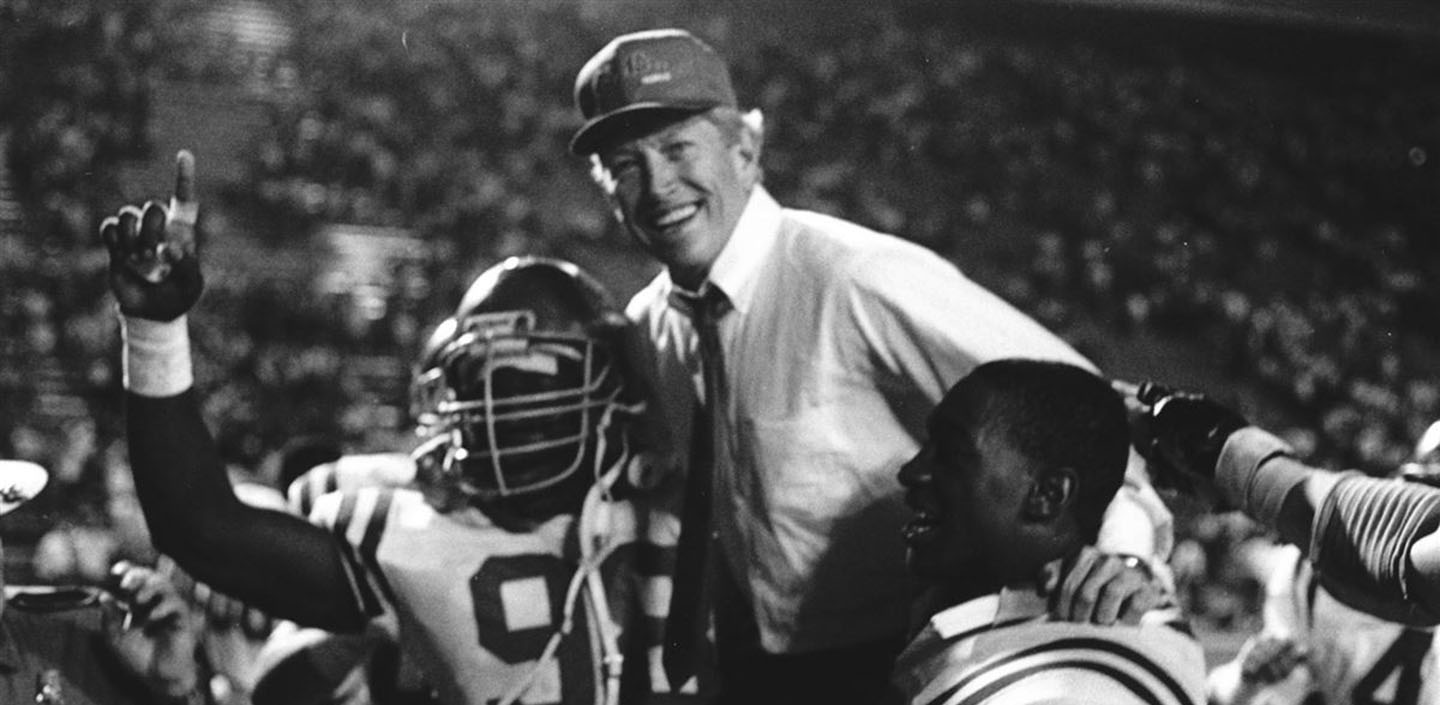 Somewhere in his neat and lived-in house off Jefferson Davis Parkway is a plaque I gave him that represents first place in the Associated Press Sports Editors feature writing competition from 1986, which I won because Nico van Thyn and the Shreveport Journal entered me; who knew there was such a thing? It was a feature on him the week of the LSU game, late-October of 1986. “Rebel With A Cause,” or something like that was the headline. This is back when the paper could afford such things, so I went to Oxford and stayed a couple of days: I remember eating lunch with Coach Brewer at the training table at Ole Miss, going to practice, talking to lots of players and Rebel faithful, that kind of thing. It was a big game for him in Tiger Stadium that Saturday night, Nov. 1, 1986. A lot of former Tech assistants were with him on the Rebel sideline.