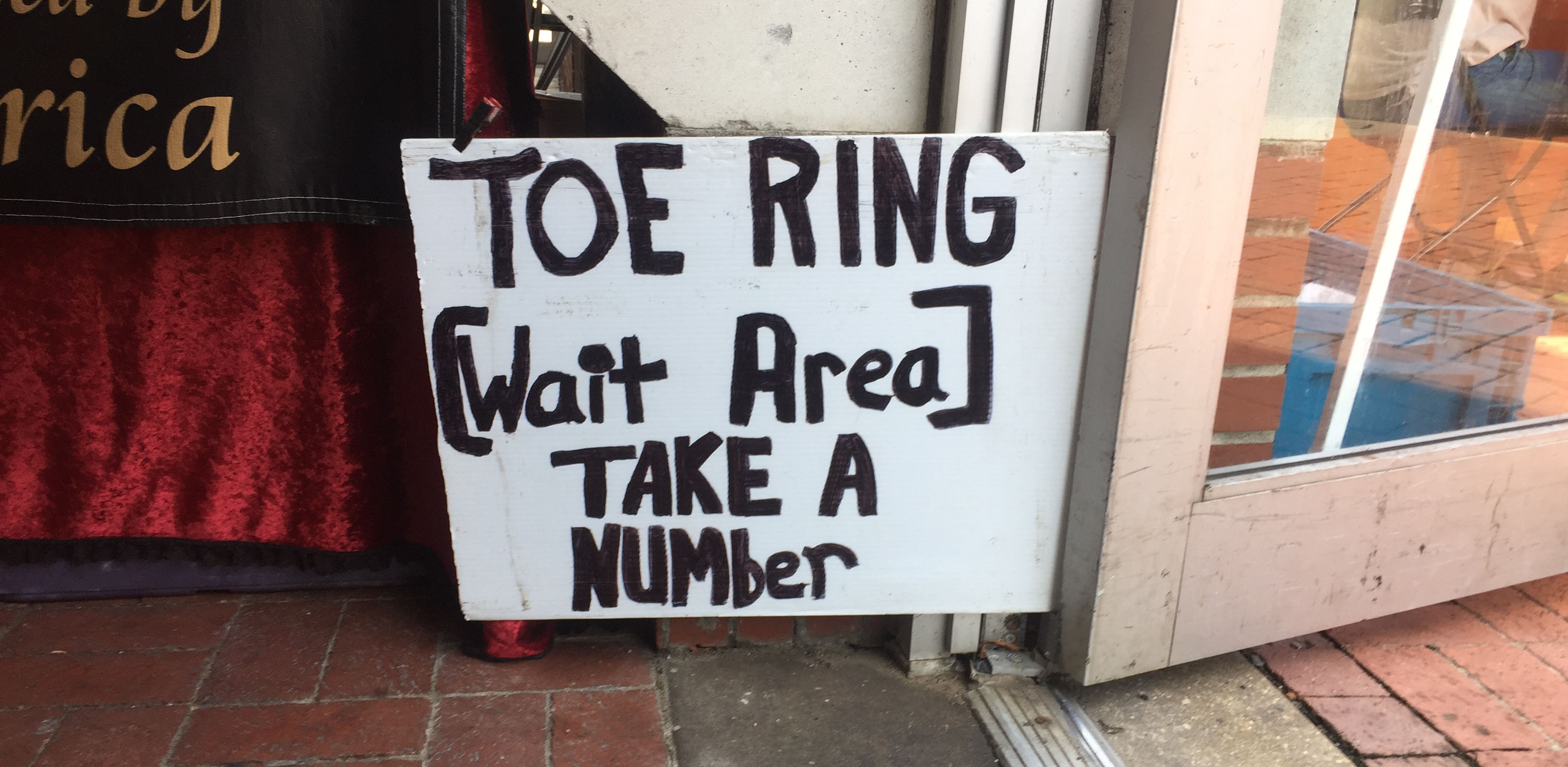 There was no such problem on this steamy morning. Maybe it was the humidity or the time of day, or maybe all the toes needing toe rings slept in, but business was slack on this particular lazy day. There were ten toes in the Getting Fitted Area and, despite two million toes within this sign’s gravitation pull, no toes on deck.